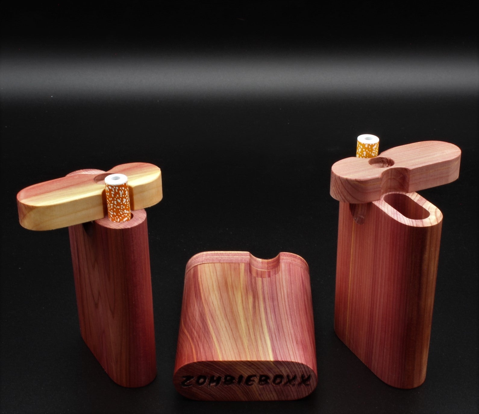 Simple, Elegant design with your needs in mind. Handcrafted from premium black walnut, this model features a customized spring and a precisely carved top that remains securely in place. Clean large Pockets with smooth flat bottoms for easy pipe filling. Includes a metal pipe. Will fit in your pocket easily. This signature box shape proudly bears the Zombieboxx stamp on the bottom, just like all other models. And now, it offers an impressive 80% more pocket space.
