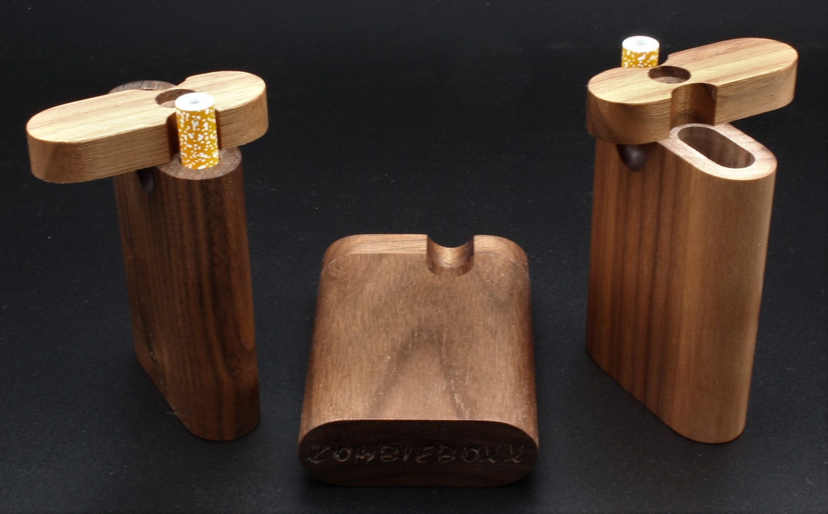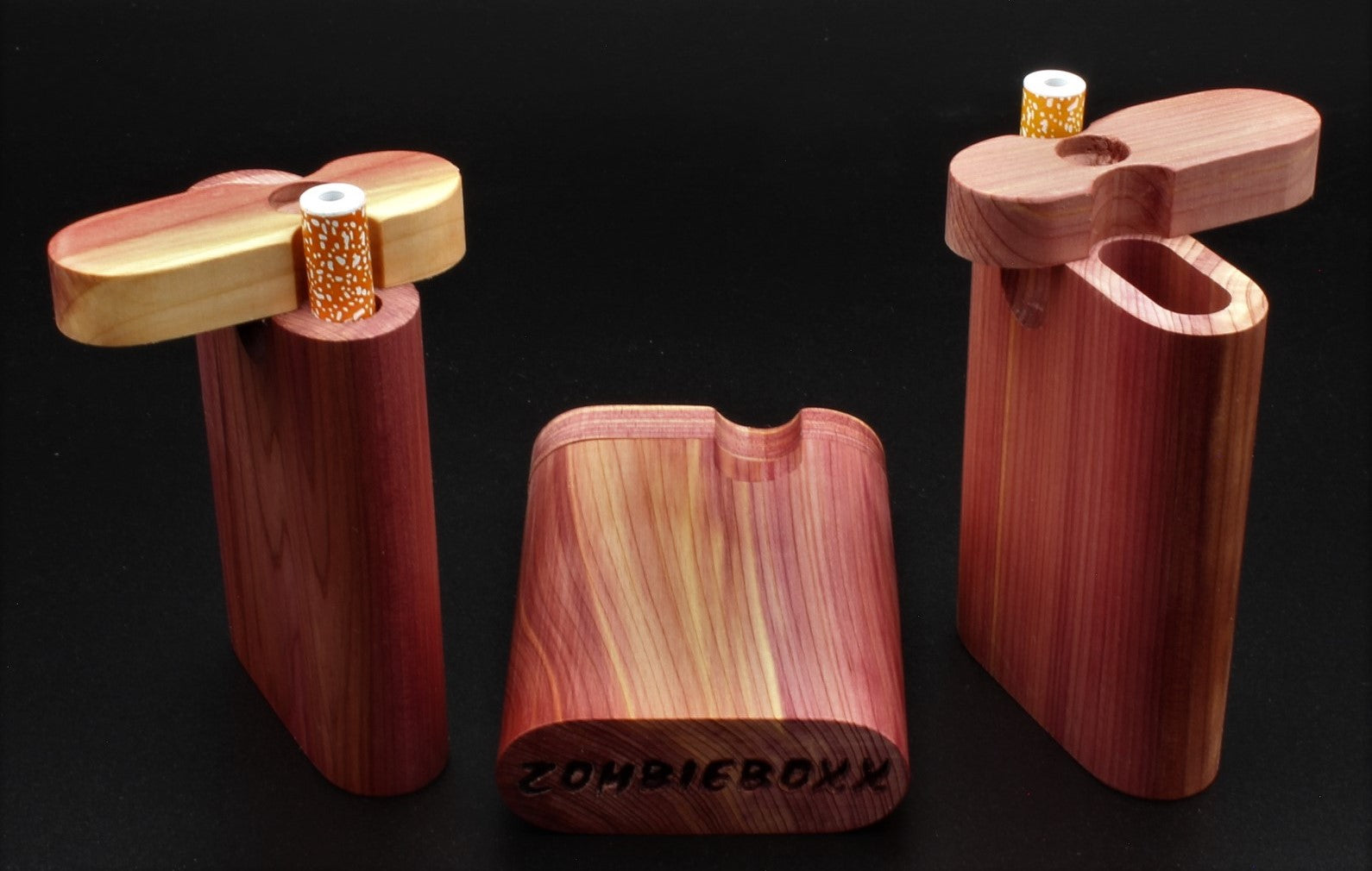 Simple, Elegant design with your needs in mind. Handcrafted from premium aromatic red cedar this model features a customized spring and a precisely carved top that remains securely in place. Clean large Pockets with smooth flat bottoms for easy pipe filling. Includes a metal pipe. Will fit in your pocket easily. This signature box shape proudly bears the Zombieboxx stamp on the bottom, just like all other models. And now, it offers an impressive 80% more pocket space.